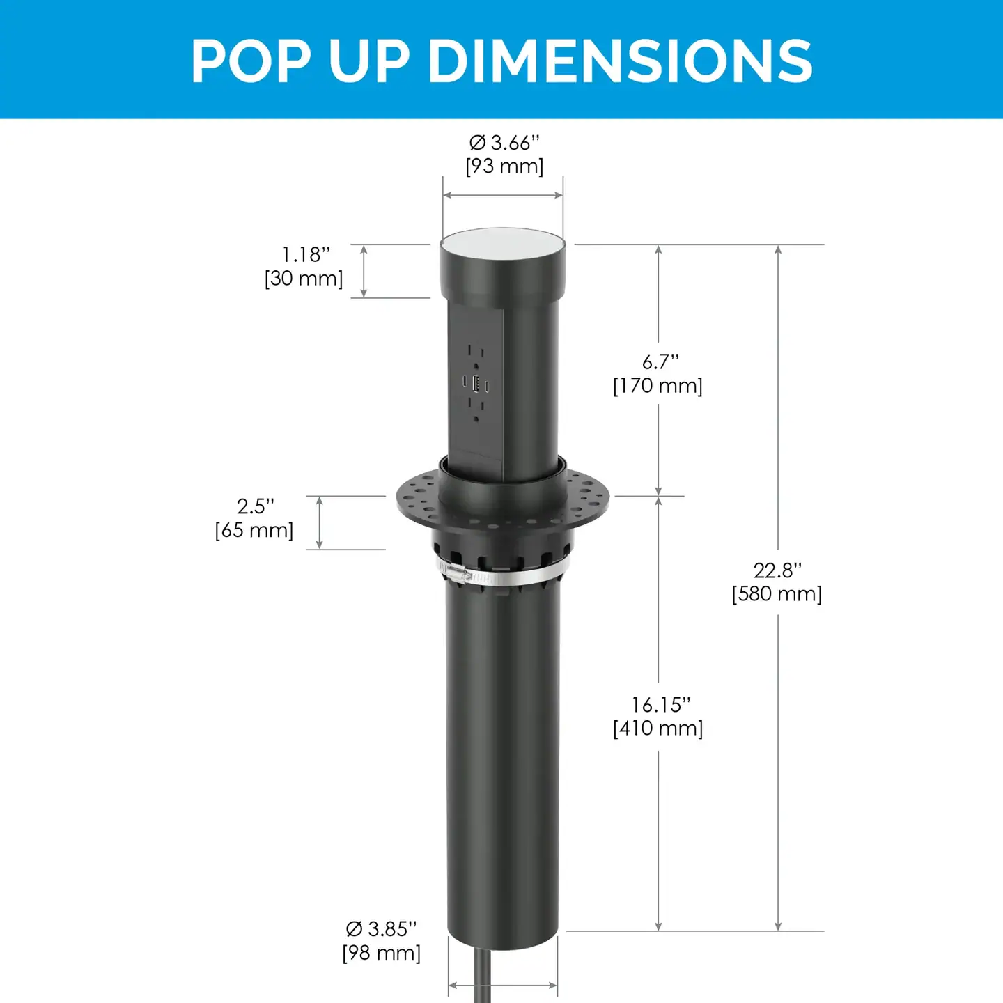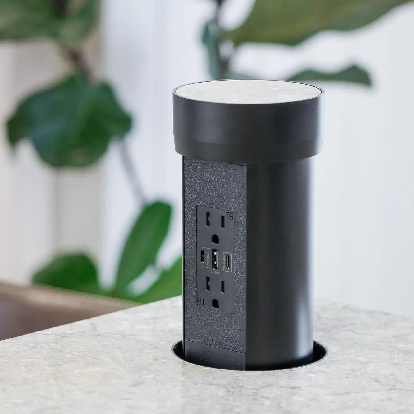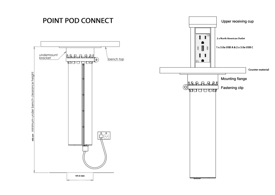 Achieve a flawless, integrated look with the Point Pod Connect’s flush countertop installation. Designed to preserve the clean lines of your stone or wood countertop, this pop-up outlet utilizes a piece of your countertop material as the top cover, ensuring a seamless blend with your existing décor. Mount the pop-up outlet in any direction to meet design preferences and the constraint of 18″ of clearance required under the countertop. Available in silver and black outlet finishes, the Point Pod Connect is ideal for professionals who prioritize smart functionality and simple aesthetics for modern living.