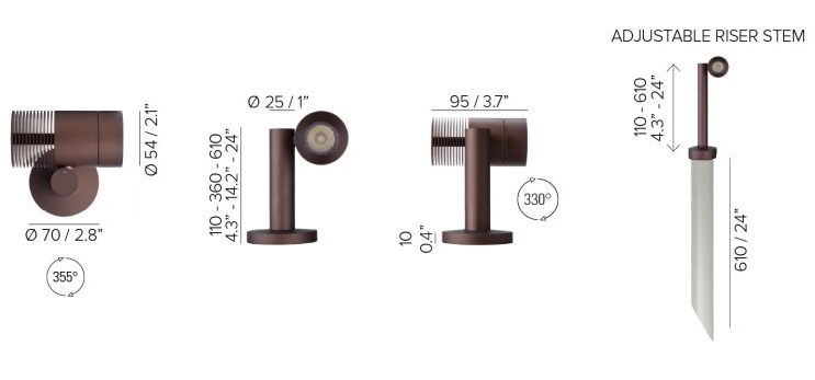 • No visible screws and feeding cable hidden into the stem, the luminaire is available in three heights: 4.3”, 14.2”, 24”