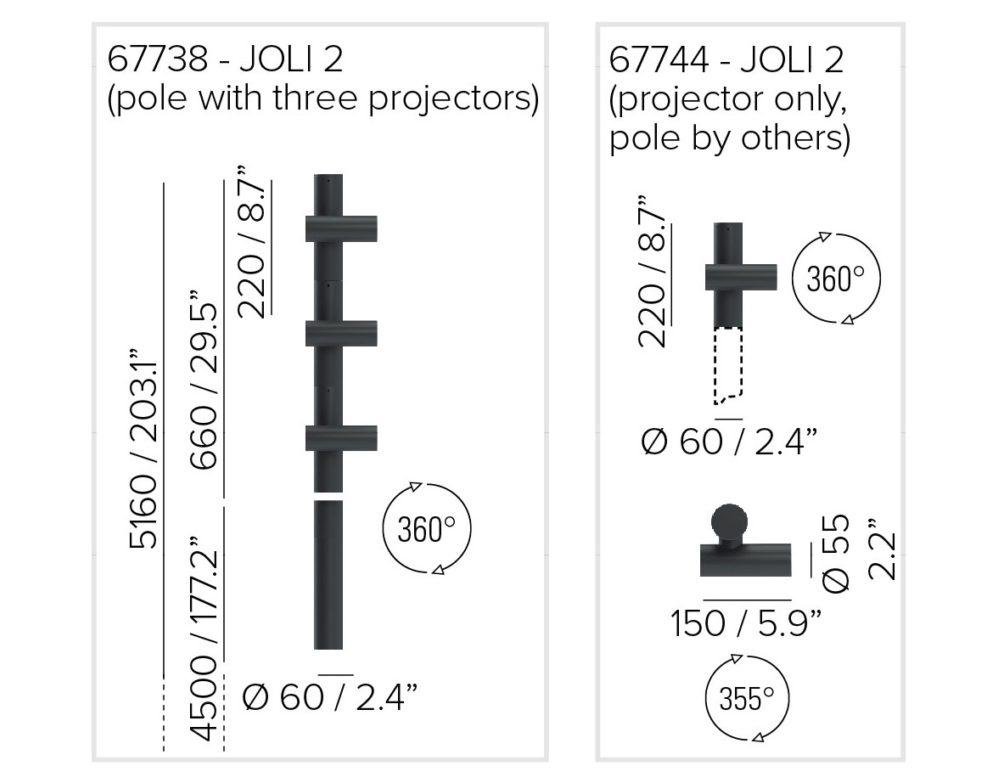 • Projector diameter 2.17″, length 5.91”. Each projector is adjustable 355° on the horizontal plane and 360° on the vertical plan